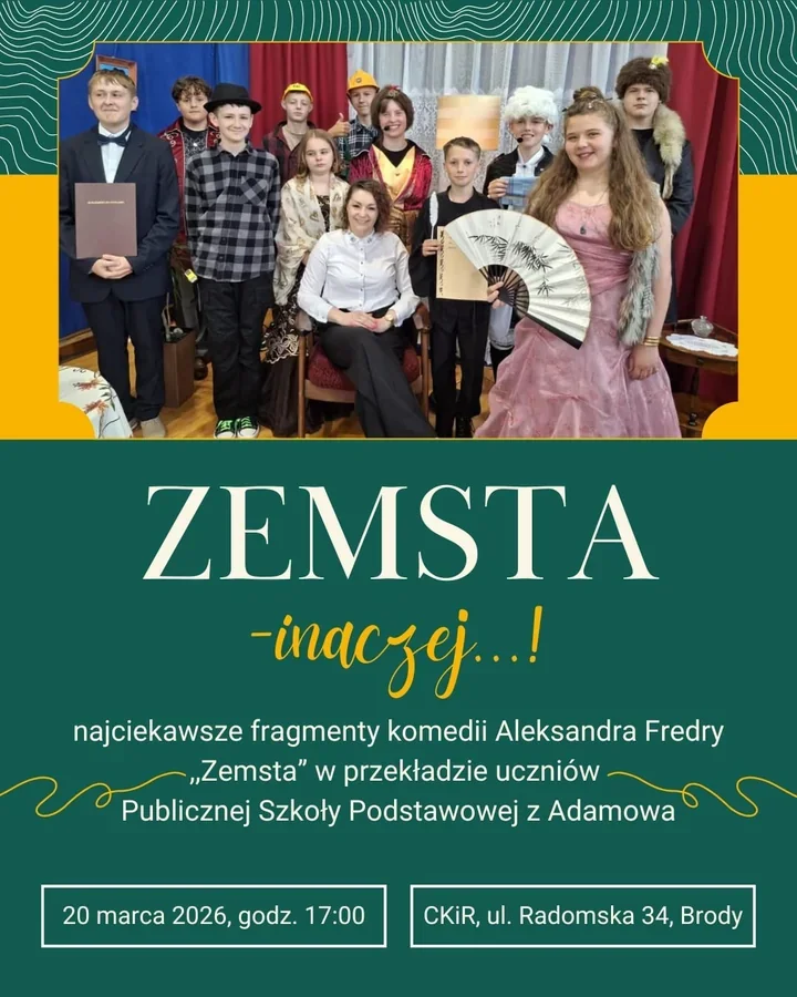 W sali Centrum Kultury i Rekreacji w Brodach pojawi się gwar i śmiech szkolnego teatru – to propozycja dla rodzin i osób, które chcą zobaczyć znaną komedię w nietypowym wydaniu. Młodzi aktorzy z Adamowa przygotowali adaptację Fredry pełną humoru i sąsiedzkich sporów, która ma postawić na emocje zamiast patosu. Wydarzenie potraktowane jest jako okazja do wspólnego wieczoru kulturalnego i wsparcia lokalnej inicjatywy artystycznej.