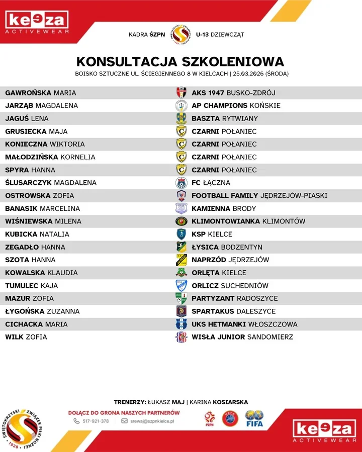 Konsultacja kadry do lat 13 odbędzie się 25 marca na sztucznym boisku przy Hotelu Stadion w Kielcach , przy ul. Ściegiennego 8. To właśnie tam młode zawodniczki mają zaprezentować się trenerom i pokazać, że potrafią nie tylko dobrze wejść w mecz, ale też utrzymać poziom w pracy szkoleniowej.