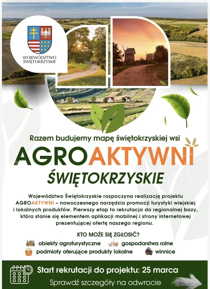 Województwo Świętokrzyskie uruchomiło inicjatywę AgroAKTYWNI po to, by pokazać wieś nie jako dodatek do regionu, ale jako jego pełnoprawną wizytówkę. W planie jest aplikacja mobilna i strona internetowa, które połączą w jednym miejscu ofertę wypoczynkową i produktową. Dla osób szukających noclegu, jedzenia prosto od gospodarza albo lokalnego trunku ma to być szybka droga do sprawdzonych adresów.