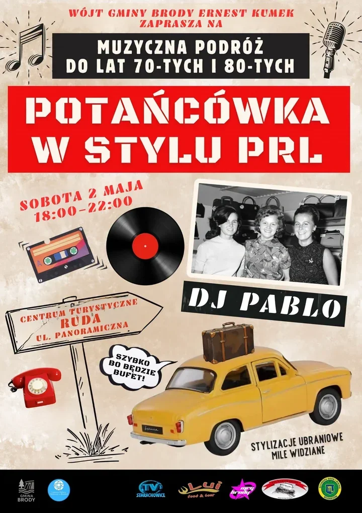 Otwarcie sezonu turystycznego w Gminie Brody przybierze w tym roku formę zabawy z wyraźnym sentymentalnym akcentem. W sobotę, 2 maja, o godz. 18.00 na terenie Centrum Turystycznego w Rudzie, przy dużym parkingu, odbędzie się potańcówka w stylu PRL. Za oprawę muzyczną odpowiada DJ Pablo, a organizatorzy zapowiadają klimat, który ma wyraźnie nawiązywać do lat 70. i 80.