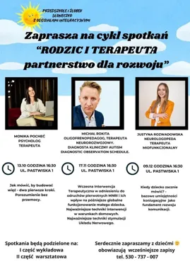 Cykl ma na celu omówienie zasad współpracy między rodzicami a terapeutami pracującymi z dziećmi, wymianę doświadczeń oraz przedstawienie praktycznych wskazówek, które ułatwiają wspieranie rozwoju dziecka w domu i placówce. Pierwsze spotkanie poprowadzi psycholog, co sugeruje, że poruszane tematy mogą obejmować aspekty rozwoju emocjonalnego, komunikacji i strategii wspierających codzienne funkcjonowanie dziecka.